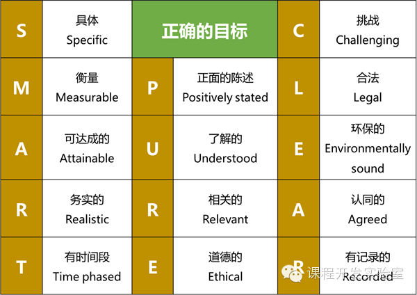 在写完目标后,安排学习者两人一组,按照讲义中提供的“惠特默模型”(见下图)检查对方的目标是否合格?如果不合格的话,让他们讨论如何将现有目标描述成为合格的目标,同时我还要求学习者总结在设定目标中出现的问题和自己对于目标管理的困惑。
